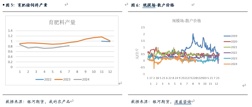 散戶減量仍然是豬源供應(yīng)減少最主要的部分,從三方機(jī)構(gòu)公布的飼料數(shù)據(jù)來看,鋼聯(lián)口徑育肥料環(huán)比增加約5.33%,由此折算同比降幅大約在13.09%,根據(jù)涌益口徑折算,同比降幅大約在15%左右。由于在統(tǒng)計供應(yīng)端的出欄量表現(xiàn),因此主要參照的是育肥數(shù)據(jù),從兩家公布的數(shù)據(jù)來看,整體還是保持著比較高的共同趨勢。可以看到,在過去的幾個月中,育肥料的環(huán)比一直呈現(xiàn)增加狀態(tài),說明在此前一段時間中,散戶補(bǔ)欄積極性有所提高,這也從側(cè)面反映了仔豬銷量的一大流向。其實總體來看,仔豬料環(huán)比增長從今年前期就開始有一定表現(xiàn),母豬料雖然也有所增加,但是增速整體偏慢,且相對比較平穩(wěn)。從出欄端考慮,育肥料銷量同比下降反映了前期育肥豬存欄數(shù)量的減少,同時出欄數(shù)量也有所減少,不過由于月內(nèi)生豬出欄體重整體較去年有明顯增加,預(yù)計散戶適重生豬在月內(nèi)降幅可能更加明顯,根據(jù)飼料線性推算來看,減幅大約在17%-18%左右。不過需要考慮的是,月內(nèi)散戶出欄積極性整體有所增加,從規(guī)模廠與散戶出欄比價來看,本月二者價差有所反彈,一定程度反映了散戶出欄積極性有所提高的情況。