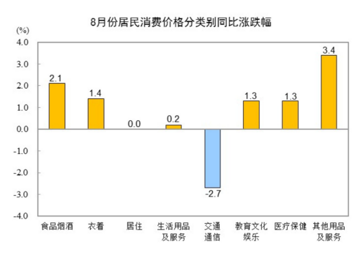 8月份,全國(guó)居民消費(fèi)價(jià)格環(huán)比上漲0.4%。其中,城市上漲0.3%,農(nóng)村上漲0.4%;食品價(jià)格上漲3.4%,非食品價(jià)格下降0.3%;消費(fèi)品價(jià)格上漲0.7%,服務(wù)價(jià)格下降0.1%。