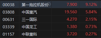 重型機械股漲勢活躍,第一拖拉機股份漲超9%。農(nóng)業(yè)農(nóng)村部、國家發(fā)展改革委、財政部聯(lián)合印發(fā)《關(guān)于加大工作力度持續(xù)實施好農(nóng)業(yè)機械報廢更新補貼政策的補充通知》,提出要持續(xù)實施好農(nóng)機報廢更新補貼政策,加力推進(jìn)老舊農(nóng)機報廢更新,加快農(nóng)機結(jié)構(gòu)調(diào)整。