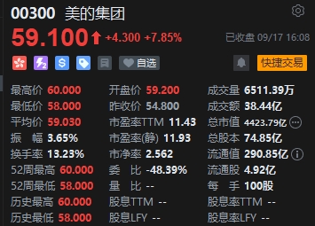 美的集團上市首日收漲7.85%。美的集團港股最終發(fā)售價為54.80港元/股(上限定價),實現(xiàn)“A+H”上市。以54.8港元定價計,較上周五(13日)A股收市價63.51元人民幣(折合69.78港元),折讓約21.5%。根據(jù)招股結果,公開發(fā)售階段獲5.31倍認購,公開發(fā)售的發(fā)售股份最終數(shù)目為2829.78萬股股份,占發(fā)售股份總數(shù)的約5%。合共接獲13717份有效申請,受理申請數(shù)目13717份,申購一手獲配發(fā)H股份占所申請總數(shù)的概約百分比為100%。