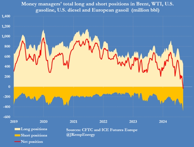 知名能源分析師John Kemp最近警告,包括對(duì)沖基金在內(nèi)的眾多機(jī)構(gòu)投資者對(duì)油價(jià)的悲觀程度前所未有,因?yàn)橛雄E象表明全球主要經(jīng)濟(jì)體增長(zhǎng)引擎正在熄火。投資者還得出結(jié)論,OPEC+已經(jīng)別無選擇,不太可能進(jìn)一步限制產(chǎn)量以支撐油價(jià)。