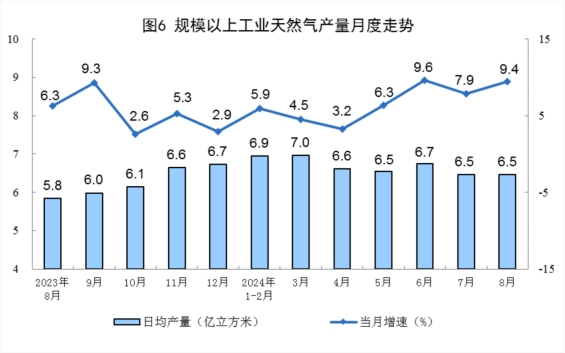天然氣生產(chǎn)加快。8月份,規(guī)上工業(yè)天然氣產(chǎn)量200億立方米,同比增長(zhǎng)9.4%,增速比7月份加快1.5個(gè)百分點(diǎn);日均產(chǎn)量6.5億立方米。進(jìn)口天然氣1176萬(wàn)噸,同比增長(zhǎng)9.1%。