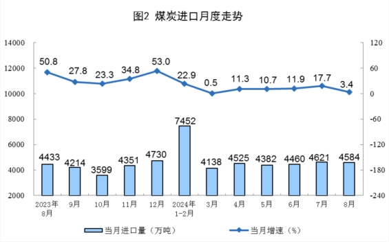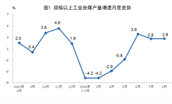原煤生產(chǎn)平穩(wěn)增長(zhǎng)。8月份,規(guī)上工業(yè)原煤產(chǎn)量4.0億噸,同比增長(zhǎng)2.8%,增速與7月份持平;日均產(chǎn)量1279.2萬(wàn)噸。進(jìn)口煤炭4584萬(wàn)噸,同比增長(zhǎng)3.4%。