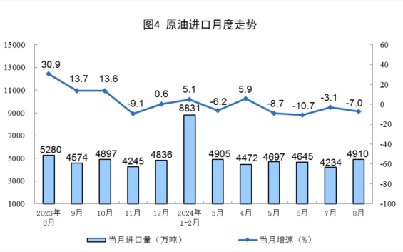 原油生產(chǎn)穩(wěn)定增長(zhǎng)。8月份,規(guī)上工業(yè)原油產(chǎn)量1783萬(wàn)噸,同比增長(zhǎng)2.1%;日均產(chǎn)量57.5萬(wàn)噸。進(jìn)口原油4910萬(wàn)噸,同比下降7.0%。
