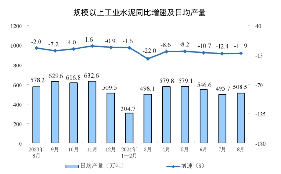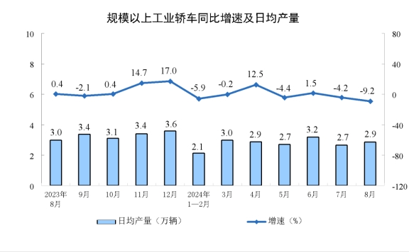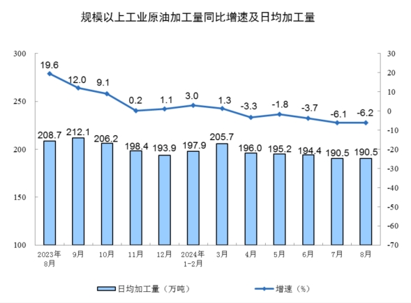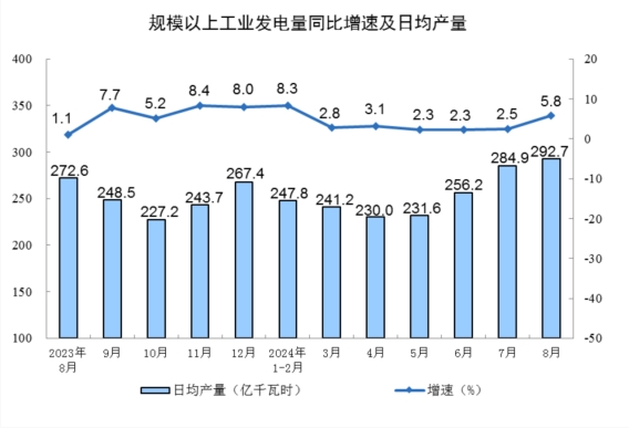 分產(chǎn)品看,8月份,規(guī)模以上工業(yè)619種產(chǎn)品中有339種產(chǎn)品產(chǎn)量同比增長。其中,鋼材11090萬噸,同比下降6.5%;水泥15763萬噸,下降11.9%;十種有色金屬662萬噸,增長4.0%;乙烯274萬噸,下降1.5%;汽車251.1萬輛,下降2.3%,其中新能源汽車110.5萬輛,增長30.5%;發(fā)電量9074億千瓦時(shí),增長5.8%;原油加工量5907萬噸,下降6.2%。