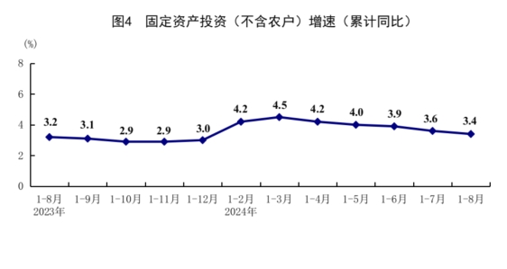 1-8月份,全國固定資產(chǎn)投資(不含農(nóng)戶)329385億元,同比增長3.4%;扣除房地產(chǎn)開發(fā)投資,全國固定資產(chǎn)投資增長7.7%。分領域看,基礎設施投資同比增長4.4%,制造業(yè)投資增長9.1%,房地產(chǎn)開發(fā)投資下降10.2%。全國新建商品房銷售面積60602萬平方米,同比下降18.0%;新建商品房銷售額59723億元,下降23.6%。分產(chǎn)業(yè)看,第一產(chǎn)業(yè)投資同比增長2.9%,第二產(chǎn)業(yè)投資增長12.1%,第三產(chǎn)業(yè)投資下降0.8%。民間投資同比下降0.2%;扣除房地產(chǎn)開發(fā)投資,民間投資增長6.3%。高技術產(chǎn)業(yè)投資同比增長10.2%,其中高技術制造業(yè)和高技術服務業(yè)投資分別增長9.6%、11.7%。高技術制造業(yè)中,航空、航天器及設備制造業(yè),電子及通信設備制造業(yè)投資分別增長34.4%、10.0%;高技術服務業(yè)中,專業(yè)技術服務業(yè)、電子商務服務業(yè)投資分別增長27.7%、16.8%。8月份,固定資產(chǎn)投資(不含農(nóng)戶)環(huán)比增長0.16%。