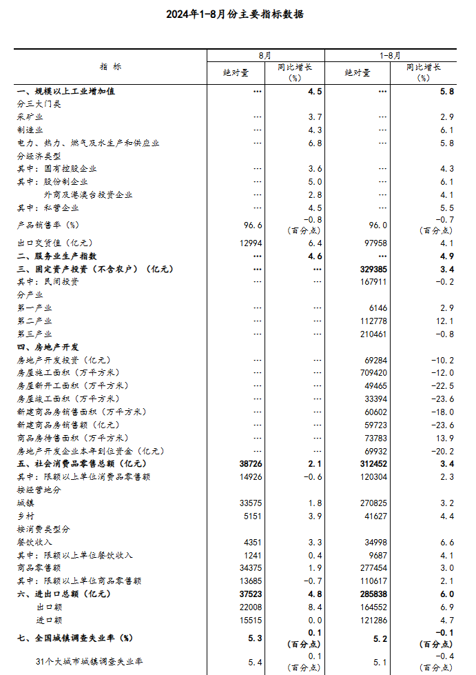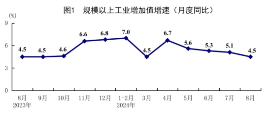 8月份,全國規(guī)模以上工業(yè)增加值同比增長4.5%;環(huán)比增長0.32%。分三大門類看,采礦業(yè)增加值同比增長3.7%,制造業(yè)增長4.3%,電力、熱力、燃氣及水生產(chǎn)和供應業(yè)增長6.8%。裝備制造業(yè)增加值同比增長6.4%,高技術制造業(yè)增加值增長8.6%,分別快于全部規(guī)模以上工業(yè)增加值1.9和4.1個百分點。分經(jīng)濟類型看,國有控股企業(yè)增加值同比增長3.6%;股份制企業(yè)增長5.0%,外商及港澳臺投資企業(yè)增長2.8%;私營企業(yè)增長4.5%。分產(chǎn)品看,新能源汽車、服務機器人、集成電路產(chǎn)品產(chǎn)量同比分別增長30.5%、20.1%、17.8%。1-8月份,全國規(guī)模以上工業(yè)增加值同比增長5.8%。8月份,制造業(yè)采購經(jīng)理指數(shù)為49.1%,企業(yè)生產(chǎn)經(jīng)營活動預期指數(shù)為52.0%。1-7月份,全國規(guī)模以上工業(yè)企業(yè)實現(xiàn)利潤總額40992億元,同比增長3.6%。