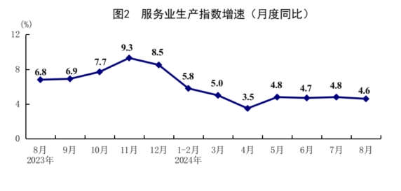 8月份,全國服務業(yè)生產(chǎn)指數(shù)同比增長4.6%。分行業(yè)看,信息傳輸、軟件和信息技術服務業(yè),租賃和商務服務業(yè),金融業(yè),交通運輸、倉儲和郵政業(yè)生產(chǎn)指數(shù)同比分別增長12.1%、9.4%、5.7%、5.2%,分別快于服務業(yè)生產(chǎn)指數(shù)7.5、4.8、1.1、0.6個百分點。1-8月份,全國服務業(yè)生產(chǎn)指數(shù)同比增長4.9%。1-7月份,規(guī)模以上服務業(yè)企業(yè)營業(yè)收入同比增長7.4%。8月份,服務業(yè)商務活動指數(shù)為50.2%,服務業(yè)業(yè)務活動預期指數(shù)為55.4%。其中,鐵路運輸、航空運輸、郵政、電信廣播電視及衛(wèi)星傳輸服務、文化體育娛樂等行業(yè)商務活動指數(shù)位于55.0%以上較高景氣區(qū)間。
