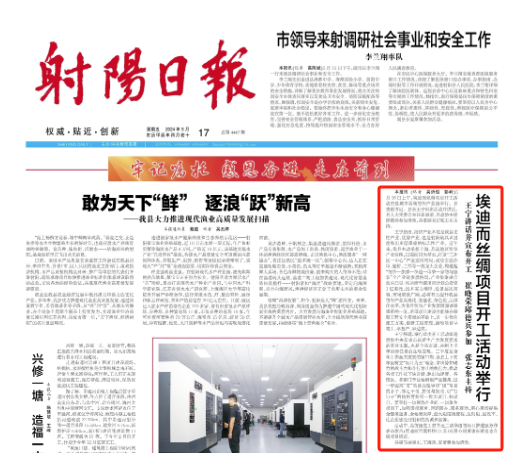 5月16日上午,埃迪而絲綢項目開工活動在鹽城市高端紡織產(chǎn)業(yè)園舉行。射陽縣委副書記、縣長王寧出席活動并講話。射陽縣人大常委會主任崔曉榮、射陽縣政協(xié)主席邱德兵參加活動,射陽縣委副書記張志東主持。