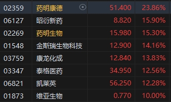 醫(yī)藥外包概念股漲幅居前,藥明康德漲近24%。交銀國際(0.255, 0.01, 6.25%)認為,美國生物安全法案未被納入NDAA,意味著生物安全法案立法進一步被推遲,年內(nèi)單獨立法的可能性下降,同時S.3558號法案最新版未納入藥明生物(15.98, 2.12, 15.30%),根據(jù)美國立法流程,該行認為其他被提及的公司也有最終被除名的可能。考慮到美聯(lián)儲正式啟動降息、行業(yè)訂單邊際改善,預計頭部CXO的投資情緒將邊際回暖,但進一步估值修復或許需要更多業(yè)績復蘇的能見度。