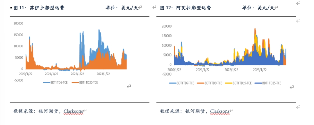中小型原油油輪船只較為充足,導(dǎo)致運(yùn)價(jià)易受到需求端影響。分航線來看,截至9月23日,TD6-TCE(俄羅斯-意大利)9月均價(jià)為21740美元/天,環(huán)比-12.84%;TD20-TCE(西非-英國大陸)9月均價(jià)為26980美元/天,環(huán)比+10.56%。TD9-TCE(加勒比海-美灣)8月均價(jià)為11232美元/天,環(huán)比-29.76%。