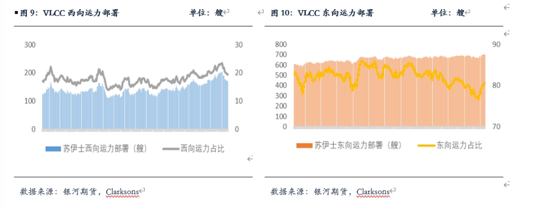 從運(yùn)力結(jié)構(gòu)來看,VLCC東西運(yùn)力一直處于分布不均的狀態(tài),東向運(yùn)力一直遠(yuǎn)超西向運(yùn)力。2024年9月西向運(yùn)力部署均值達(dá)到173艘,東向運(yùn)力部署均值達(dá)到713艘,該現(xiàn)象較4、5月正在緩慢加劇,二季度開始西部運(yùn)力占比維持下跌走勢(shì)。