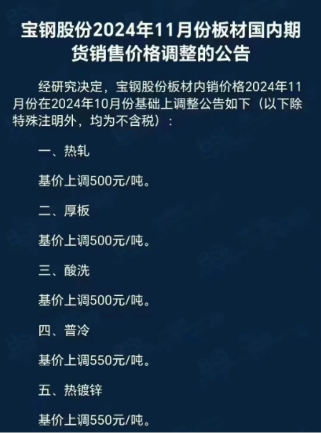 近日,寶鋼、鞍鋼、本鋼等國內(nèi)一批大型鋼鐵企業(yè)公布了2024年11月份產(chǎn)品價(jià)格政策調(diào)整信息,均在10月份的基礎(chǔ)上大幅上調(diào)了出廠價(jià),每噸最高上調(diào)600元。