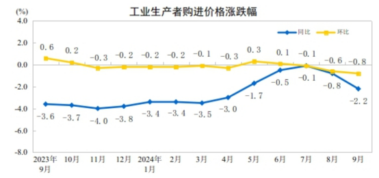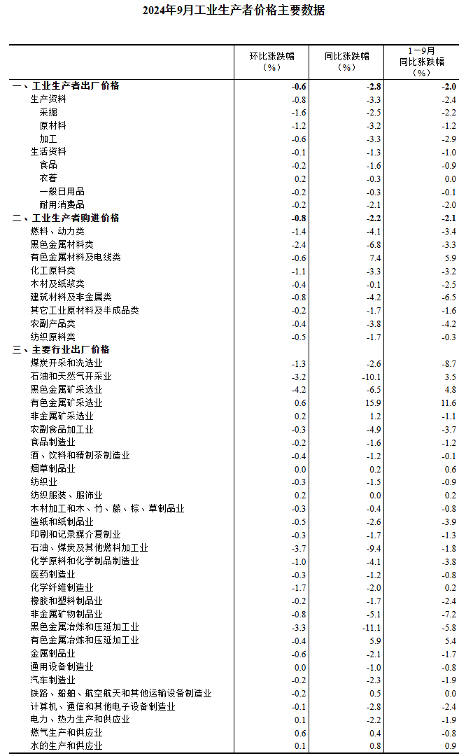 2024年9月份,全國工業(yè)生產(chǎn)者出廠價格同比下降2.8%,環(huán)比下降0.6%;工業(yè)生產(chǎn)者購進(jìn)價格同比下降2.2%,環(huán)比下降0.8%。1—9月平均,工業(yè)生產(chǎn)者出廠價格比上年同期下降2.0%,工業(yè)生產(chǎn)者購進(jìn)價格下降2.1%。