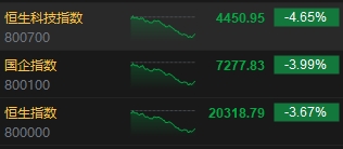 10月15日消息,今日港股三大指數(shù)低開低走,截至收盤,恒生指數(shù)(20318.791, -774.08, -3.67%)跌3.67%,報(bào)20318.79點(diǎn),恒生科技指數(shù)(4450.95, -217.23, -4.65%)跌4.65%,國(guó)企指數(shù)跌3.99%。盤面上,科網(wǎng)股普跌,美團(tuán)跌近7%,百度跌近6%,阿里巴巴、京東跌約5%;汽車股大幅下挫,新能源汽車方向領(lǐng)跌,蔚來(lái)跌超8%;啤酒股跌幅居前,華潤(rùn)啤酒(29.45, -4.35, -12.87%)跌近13%;醫(yī)藥外包概念股集體走弱,康龍化成(14.28, -1.10, -7.15%)、泰格醫(yī)藥(35.05, -2.70, -7.15%)跌超7%;內(nèi)房股集體下跌,中梁控股(0.121, -0.03, -19.33%)跌超19%。