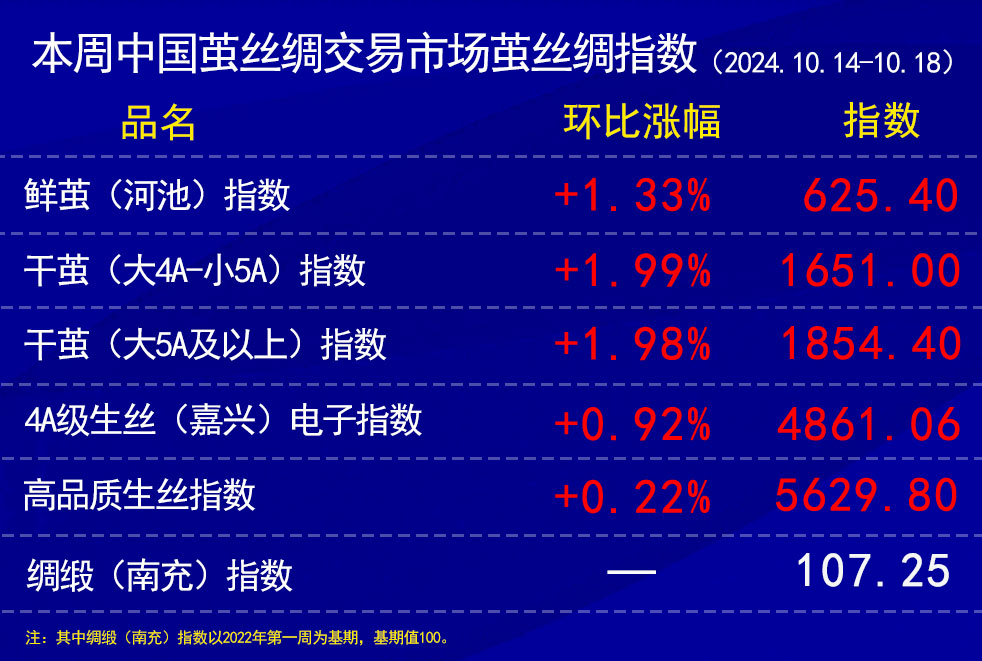 干繭指數(shù)上,結合質量和效率等主要指標,本周鮮繭收烘和干繭貿(mào)易數(shù)據(jù)經(jīng)標準化處理后,也繼續(xù)有所上漲,兩個等級的干繭價格指數(shù)分別環(huán)比上漲1.99%和1.98%。