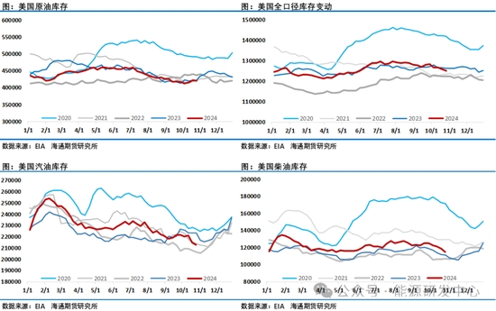 庫(kù)存方面IEA報(bào)告中稱8月全球可見(jiàn)石油庫(kù)存減少了2230萬(wàn)桶,其中原油庫(kù)存下降了1650萬(wàn)桶。經(jīng)合組織(OECD)工業(yè)庫(kù)存反季節(jié)性減少了1340萬(wàn)桶,至28.11億桶,較五年平均值低1.027億桶。而EIA在其更高頻的周度報(bào)告中美國(guó)石油庫(kù)存的持續(xù)回落也印證了這一點(diǎn),最新的EIA周報(bào)顯示美國(guó)至10月11日當(dāng)周除卻戰(zhàn)略儲(chǔ)備的商業(yè)原油庫(kù)存減少219.1萬(wàn)桶至4.21億桶,降幅0.52%。汽油庫(kù)存下降220.1萬(wàn)桶,精煉油庫(kù)存下降353.4萬(wàn)桶,上周美國(guó)墨西哥灣沿岸汽油庫(kù)存降至2021年3月以來(lái)的最低水平,精煉油庫(kù)存降幅錄得2024年3月1日當(dāng)周以來(lái)最大。