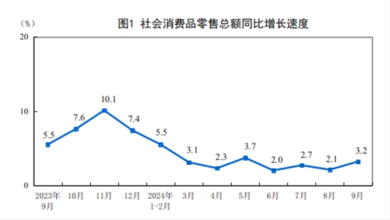 9月份,社會(huì)消費(fèi)品零售總額41112億元,同比增長(zhǎng)3.2%,增速比上月加快1.1個(gè)百分點(diǎn)。其中,除汽車以外的消費(fèi)品零售額36573億元,增長(zhǎng)3.6%。1—9月份,社會(huì)消費(fèi)品零售總額353564億元,同比增長(zhǎng)3.3%。其中,除汽車以外的消費(fèi)品零售額318203億元,增長(zhǎng)3.8%。