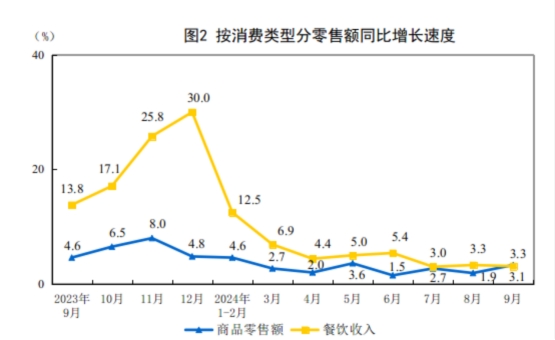 按消費(fèi)類型分,9月份,商品零售額36695億元,同比增長(zhǎng)3.3%;餐飲收入4417億元,增長(zhǎng)3.1%。1—9月份,商品零售額314149億元,增長(zhǎng)3.0%;餐飲收入39415億元,增長(zhǎng)6.2%。