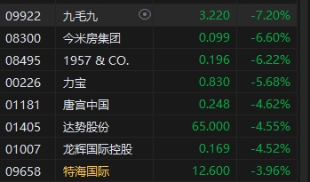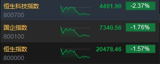10月21日消息,今日港股三大指數(shù)全天走低,截至收盤,恒生指數(shù)(20478.461, -325.65, -1.56%)跌%1.57,報(bào)20478.46點(diǎn),恒生科技指數(shù)(4491.9, -108.95, -2.37%)跌2.37%,國(guó)企指數(shù)跌1.76%。盤面上,科網(wǎng)股普跌,網(wǎng)易跌近4%,阿里巴巴、百度、京東、騰訊、美團(tuán)跌超2%;中醫(yī)藥概念股跌幅居前,中國(guó)中藥(2.48, -1.34, -35.08%)跌超35%;餐飲股紛紛下跌,九毛九(3.22, -0.25, -7.21%)績(jī)后跌超7%;SaaS概念股走弱,邁富時(shí)跌超11%;黃金股逆勢(shì)上漲,中國(guó)黃金國(guó)際(37.15, 1.90, 5.39%)漲超5%。