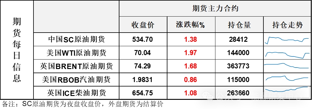 【1】WTI主力原油期貨收漲1.35美元,漲幅1.97%,報(bào)70.04美元/桶;布倫特主力原油期貨收漲1.23美元,漲幅1.68%,報(bào)74.29美元/桶;INE原油期貨收漲1.38%,報(bào)534.7元。