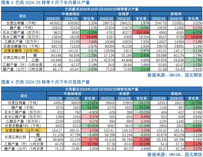 國(guó)外供需格局:中性。1)巴西中南部9月下半月壓榨數(shù)據(jù)顯示,雙周產(chǎn)糖282.9萬(wàn)噸,去年同期為337.6萬(wàn)噸,同比下降16.21%;9月下半月累計(jì)產(chǎn)糖量3315.4萬(wàn)噸,去年同期累計(jì)產(chǎn)糖量為3265.3萬(wàn)噸,上榨季累計(jì)產(chǎn)糖4245萬(wàn)噸,同比增幅1.53%。2)印度方面,最近印度政府解除了2024/25榨季用甘蔗汁生產(chǎn)乙醇的限制,提高了乙醇采購(gòu)價(jià)格,延長(zhǎng)了食糖出口限制,并且允許糖廠使用甘蔗汁和B重糖蜜生產(chǎn)乙醇。有消息稱,印度政府正在研究2025年之后進(jìn)一步提高汽油中的乙醇摻混比例。