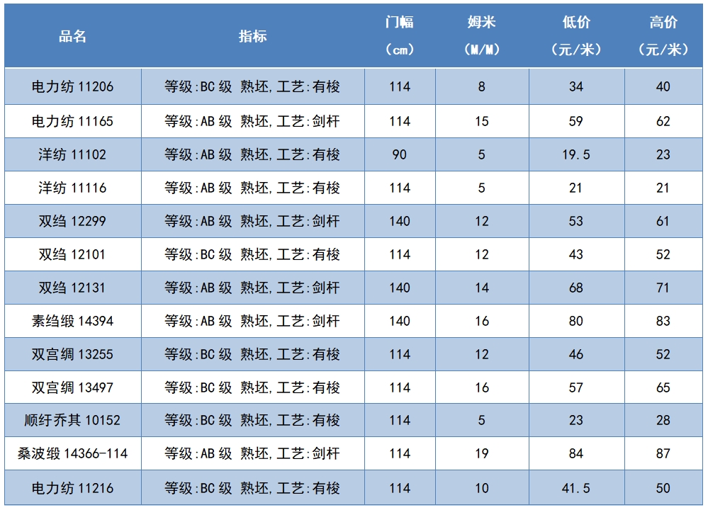本周綢緞指數(shù)協(xié)作單位成交價(jià)格區(qū)間