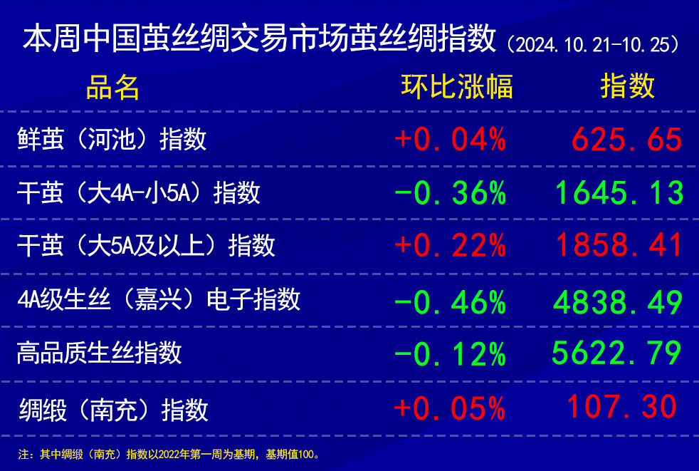 本周,繭絲綢各指數(shù)在原料成本支撐上,整體處在小幅波動(dòng)的格局之中。