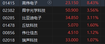 蘋果概念股漲幅居前,高偉電子漲超8%。消息面上,蘋果將于10月31日盤后公布其2024財年第四季度(即2024年第三自然季)業(yè)績。分析師最新預(yù)測,蘋果Q4營收為943.16億美元,同比增長5.38%;每股收益1.53美元,同比增長4.77%。