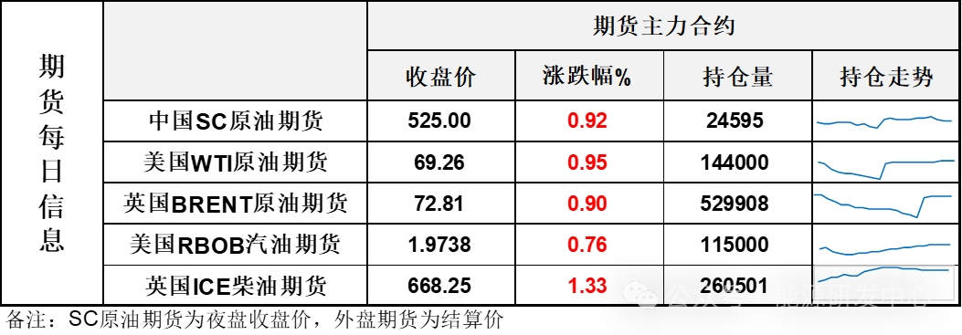 【1】WTI主力原油期貨收漲0.65美元,漲幅0.95%,報(bào)69.26美元/桶;布倫特主力原油期貨收漲0.65美元,漲幅0.9%,報(bào)72.81美元/桶;INE原油期貨收漲0.92%,報(bào)525元。
