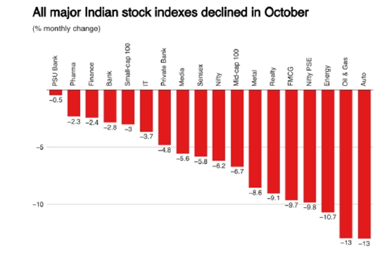 印度股市創(chuàng)下了2020年3月以來最糟糕的月度表現(xiàn)。10月份,創(chuàng)紀(jì)錄的外資外流和低迷的企業(yè)盈利,打擊了投資者的情緒。
