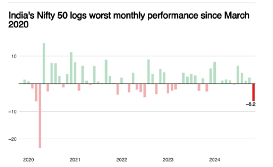 10月31日,印度NSE Nifty 50指數(shù)下跌0.56%,至24205.35點(diǎn)。而BSE Sensex指數(shù)下跌0.69%,至79389.06點(diǎn)。這兩個(gè)基準(zhǔn)在10月份都下跌了約6%,創(chuàng)下了自2020年3月新冠疫情引發(fā)全球市場大幅下滑以來最糟糕的月度表現(xiàn)。