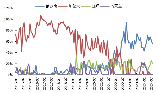 圖3:俄羅斯、加拿大和迪拜菜油在國(guó)內(nèi)月度進(jìn)口中占比(%)