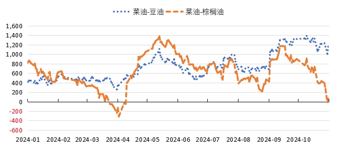 2024年9月初,國(guó)內(nèi)宣布對(duì)來自加拿大的菜籽(5208, 89.00, 1.74%)進(jìn)行反傾銷調(diào)查,市場(chǎng)擔(dān)憂后續(xù)進(jìn)口加拿大菜籽供應(yīng),隨后菜油走勢(shì)偏強(qiáng)于其他油脂,但是沒過多久,菜油卻變成三個(gè)油脂中最弱的。9月初菜油和豆油主力價(jià)差從1043元/噸擴(kuò)大至10月初最高的1386元/噸,隨后逐步走縮,截至11月1日收盤,價(jià)差縮小到1191元/噸。而從9月初開始,菜油和棕櫚油主力價(jià)差從843元/噸擴(kuò)大至9月中最高的1170元/噸,隨后走縮,截至11月1日收盤,價(jià)差縮小至111元/噸,期間甚至出現(xiàn)過菜油價(jià)格低于棕櫚油的情況。