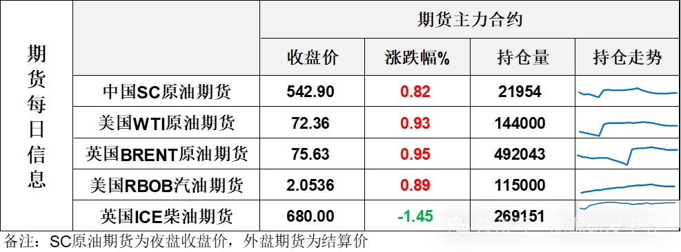 【1】WTI主力原油期貨收漲0.67美元,漲幅0.93%,報72.36美元/桶;布倫特主力原油期貨收漲0.71美元,漲幅0.95%,報75.63美元/桶;INE原油期貨收漲0.82%,報542.9元。