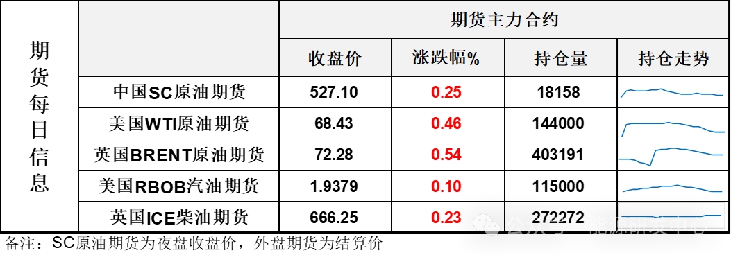 【1】WTI主力原油期貨收漲0.31美元,漲幅0.46%,報68.43美元/桶;布倫特主力原油期貨收漲0.39美元,漲幅0.54%,報72.28美元/桶;INE原油期貨收漲0.25%,報527.1元。