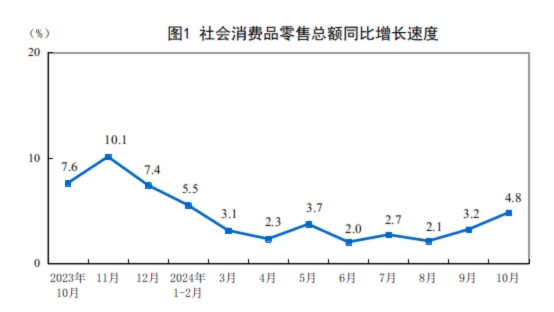 2024年10月份社會(huì)消費(fèi)品零售總額增長4.8%