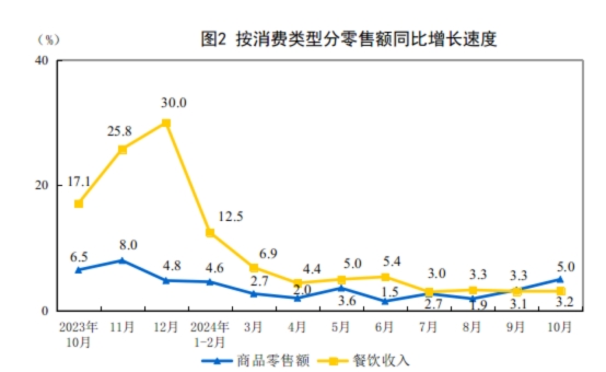 按消費(fèi)類型分,10月份,商品零售額40444億元,同比增長5.0%;餐飲收入4952億元,增長3.2%。1—10月份,商品零售額354593億元,增長3.2%;餐飲收入44367億元,增長5.9%。