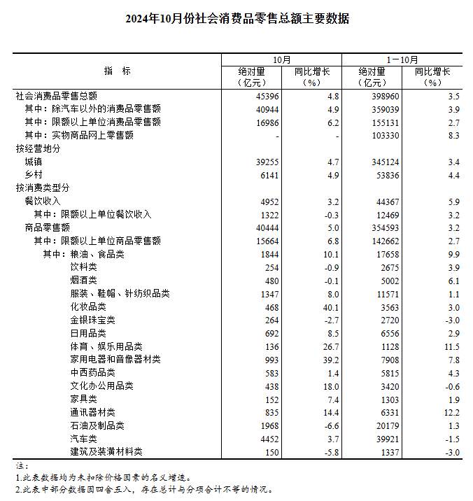 10月份,社會(huì)消費(fèi)品零售總額45396億元,同比增長4.8%,增速比上月加快1.6個(gè)百分點(diǎn)。其中,除汽車以外的消費(fèi)品零售額40944億元,增長4.9%。1—10月份,社會(huì)消費(fèi)品零售總額398960億元,同比增長3.5%。其中,除汽車以外的消費(fèi)品零售額359039億元,增長3.9%。