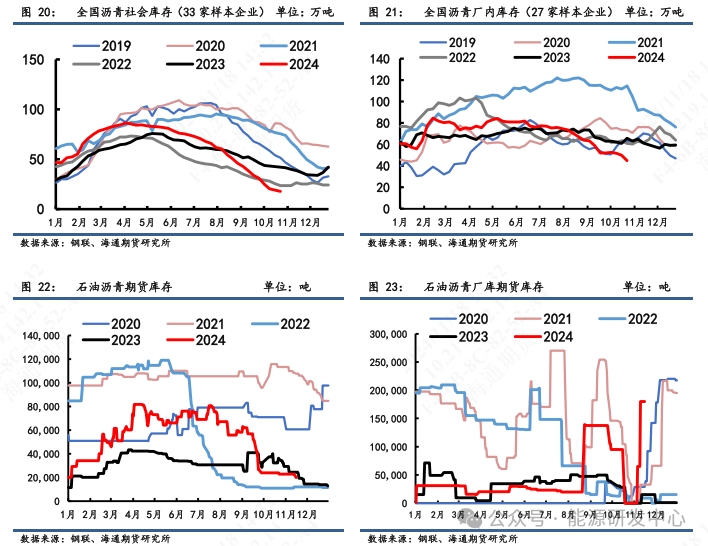 本周庫存延續(xù)下滑。現(xiàn)貨端,11月15日當(dāng)周,國內(nèi)27家樣本企業(yè)瀝青廠內(nèi)庫存為44.9萬噸,環(huán)比上周50萬噸回落10%;33家樣本企業(yè)社會庫存量為17.6萬噸,環(huán)比上周19萬噸回落7%。期貨端,11月15日石油瀝青期貨庫存為19660噸,廠內(nèi)庫存為180000噸,總期貨庫存為199860噸,環(huán)比11月8日上漲明顯。
