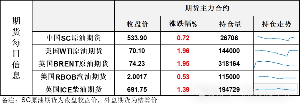 【1】WTI主力原油期貨收漲1.35美元,漲幅1.96%,報(bào)70.1美元/桶;布倫特主力原油期貨收漲1.42美元,漲幅1.95%,報(bào)74.23美元/桶;INE原油期貨收漲0.72%,報(bào)533.9元。