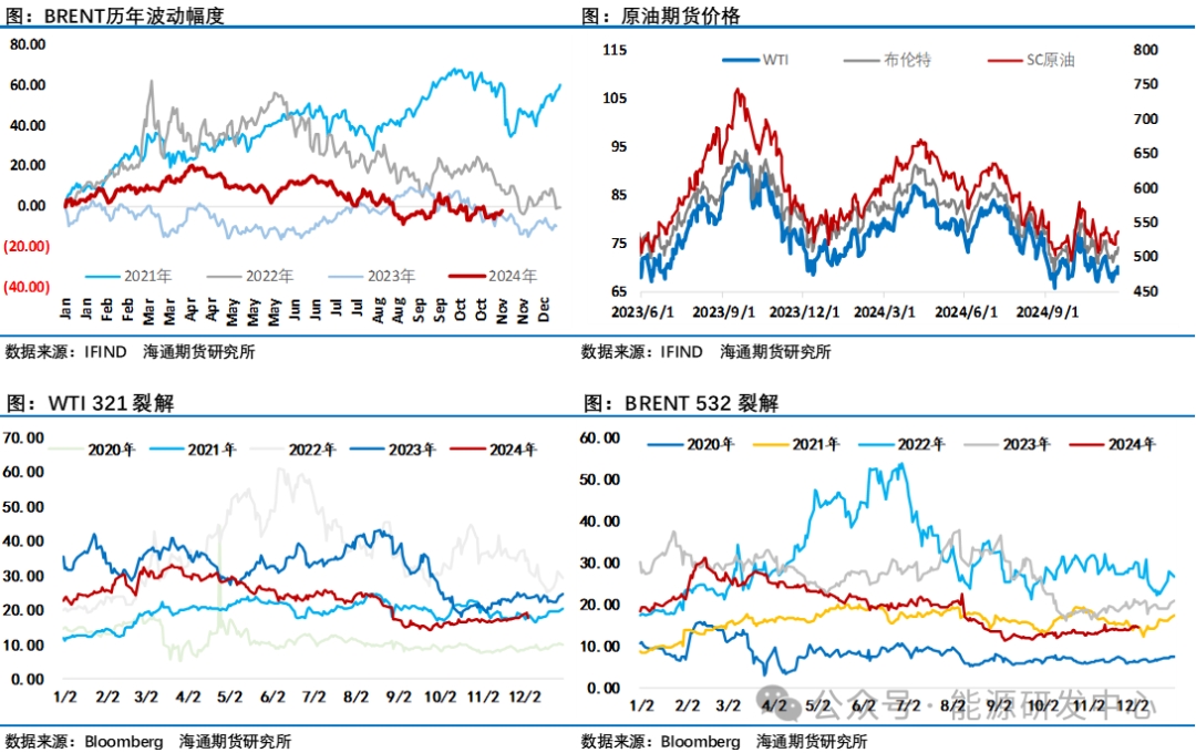 除了地緣因素吸引參與者眼球,供需層面接下來歐佩克+產(chǎn)量政策的變化也將成為關(guān)注點(diǎn),考慮到目前市場(chǎng)主流機(jī)構(gòu)認(rèn)定歐佩克+一旦退出自愿減產(chǎn),2025年將迎來非常明顯的供應(yīng)過剩局面。因此近期市場(chǎng)主流預(yù)測(cè)是歐佩克+將繼續(xù)延遲退出自愿減產(chǎn)時(shí)間,存在延遲一個(gè)月和一個(gè)季度的選項(xiàng),這意味著給了市場(chǎng)的預(yù)期是歐佩克+在12月月度會(huì)議上需要做出延遲減產(chǎn)的決定,而歐佩克+面臨的現(xiàn)實(shí)局面是在6月會(huì)議上阿聯(lián)酋日產(chǎn)量配額上調(diào)30萬桶,從2025年1月至9月逐漸完成,平均每月增產(chǎn)3.3萬桶,這樣的決定在半年前安撫了阿聯(lián)酋繼續(xù)配合歐佩克+減產(chǎn)來維持石油市場(chǎng)穩(wěn)定。這也意味著阿聯(lián)酋將可以在2025年提升產(chǎn)量,而阿聯(lián)酋增產(chǎn)對(duì)于減產(chǎn)合作來說是個(gè)挑戰(zhàn),在這之前部分國(guó)家就一直自愿減產(chǎn)不達(dá)標(biāo),阿聯(lián)酋產(chǎn)量的提升會(huì)進(jìn)一步給自愿減產(chǎn)執(zhí)行度帶來挑戰(zhàn)。屆時(shí)沙特、俄羅斯為核心的歐佩克+如何平衡內(nèi)部利益及說服相關(guān)成員國(guó)繼續(xù)團(tuán)結(jié)一致保持當(dāng)前產(chǎn)量是一個(gè)非常有考驗(yàn)的選項(xiàng)。