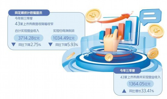 根據(jù)同花順統(tǒng)計數(shù)據(jù),今年前三季度,43家上市券商營收降幅收窄,合計實(shí)現(xiàn)營業(yè)收入3714.28億元,同比下降2.75%;實(shí)現(xiàn)歸母凈利潤1034.49億元,同比下降5.93%。