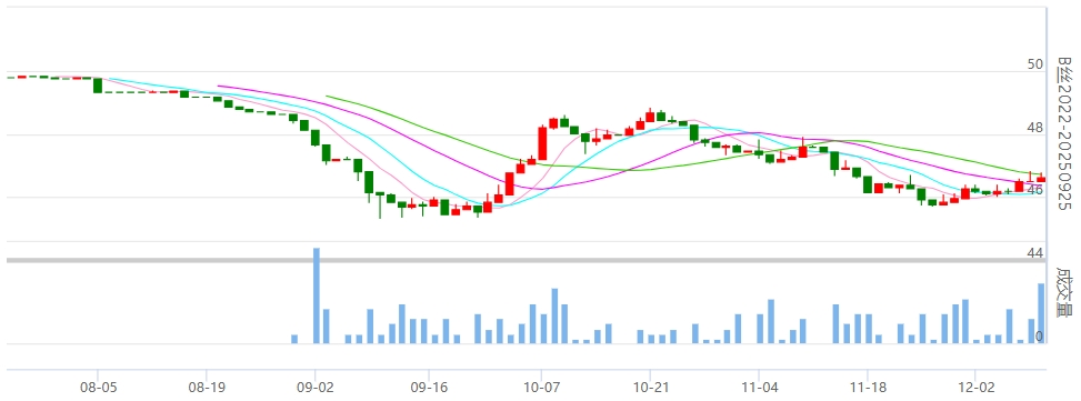 今日(2024年12月10日,周二)中國繭絲綢交易市場生絲電子指數(shù)上漲0.03%收于4717.33點。B絲2022D(商檢4A級生絲):241225合約報平收于47.82萬元;250325合約報平收于47.40萬元;250925合約上漲0.09報收于46.62萬元。