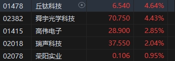 相應(yīng)的,蘋果概念股紛紛走高,丘鈦科技、舜宇光學(xué)科技(70.75, 3.00, 4.43%)漲超4%