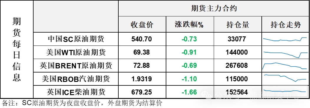 【1】WTI主力原油期貨收跌0.64美元,跌幅0.91%,報(bào)69.38美元/桶;布倫特主力原油期貨收跌0.51美元,跌幅0.69%,報(bào)72.88美元/桶;INE原油期貨收跌0.73%,報(bào)540.7元。