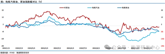中國汽柴油年內(nèi)年內(nèi)分道揚(yáng)鑣各奔前程,卻又在年末再聚首,跌幅接近一致約7.5%。但整體表現(xiàn)明顯弱于原油,在中國能源轉(zhuǎn)型大背景下,成品油消費(fèi)提速達(dá)峰,根據(jù)三方機(jī)構(gòu)跟蹤分析2024年中國汽柴油被新能源等新增替代消費(fèi)量2000萬噸左右,累計(jì)替代消費(fèi)量超5000萬噸。從相關(guān)預(yù)測來看2025年仍會有1500萬噸的汽柴油消費(fèi)進(jìn)一步被替代,全球最大的原油進(jìn)口國正在引領(lǐng)原油消費(fèi)端的變化,這是一個(gè)原油市場的全新局面。