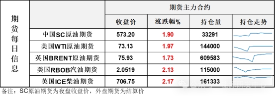 【1】WTI主力原油期貨收漲1.41美元,漲幅1.97%,報73.13美元/桶;布倫特主力原油期貨收漲1.29美元,漲幅1.73%,報75.93美元/桶;INE原油期貨收漲1.9%,報573.2元。