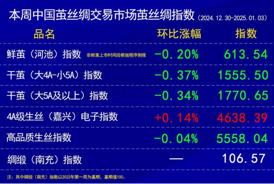 本周繭絲綢各現(xiàn)貨指數(shù)多略收綠。接近年底,產(chǎn)業(yè)鏈企業(yè)以回籠資金作為核心要務(wù)。