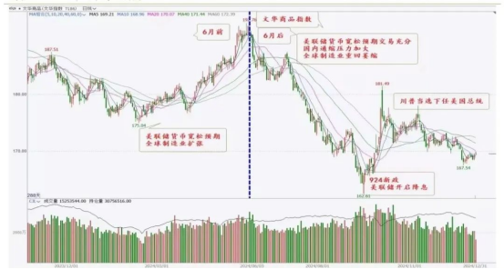 通過對該走勢圖的觀察可以發(fā)現(xiàn),尤其是進入2024年下半年之后,繭絲商品的走勢與文華商品指數(shù)的走勢呈現(xiàn)出高度的趨同性。